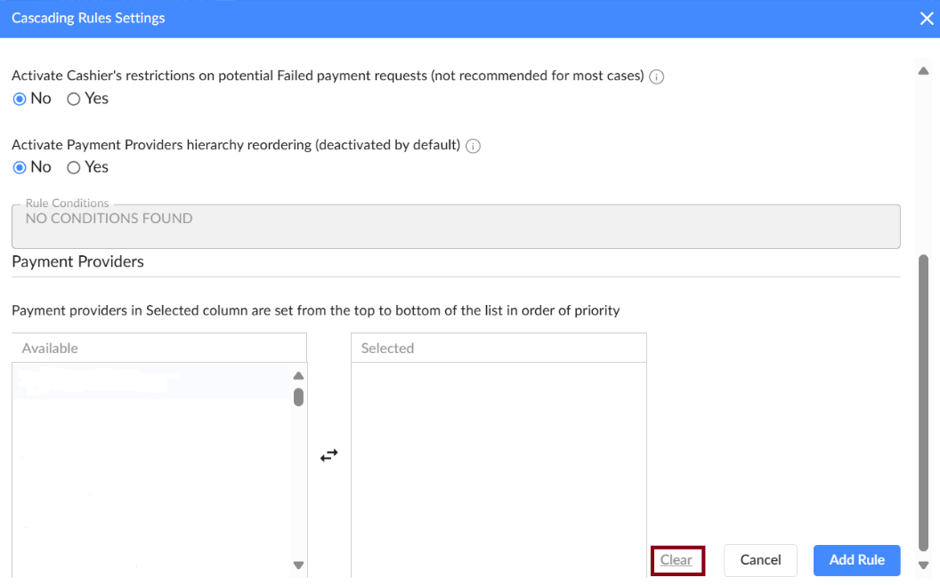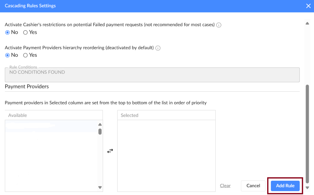 - If the request is declined by all the providers in the Selected list of the rule, Cashier will attempt to process the payment using a provider from the Selected list in the default rule. The default rule has no criteria and is placed at the bottom of the cascading rules list.
