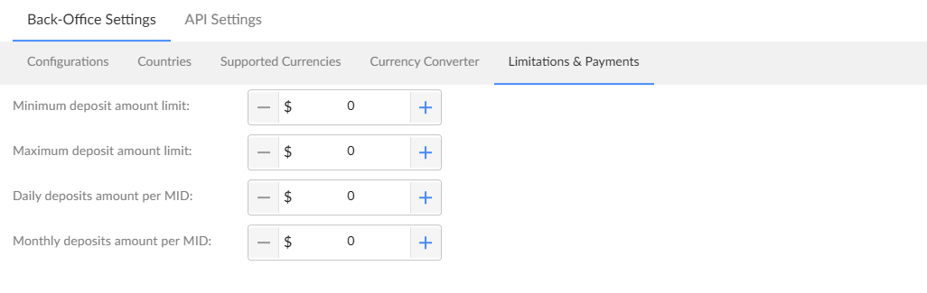- Minimum and maximum deposit amounts: Configure high-level minimum and maximum amount limits.