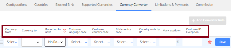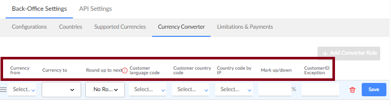 To add a new currency conversion rule, click Add Converter Rule button in the top right corner.