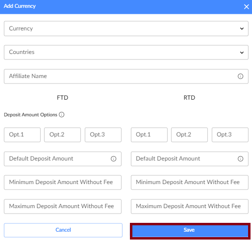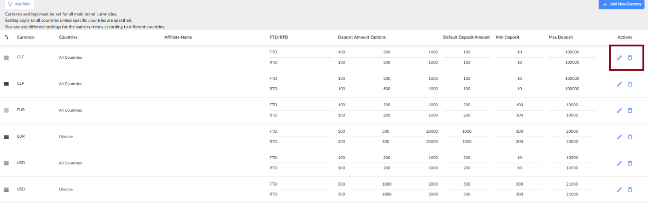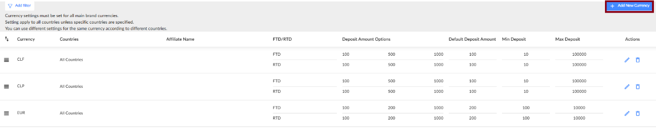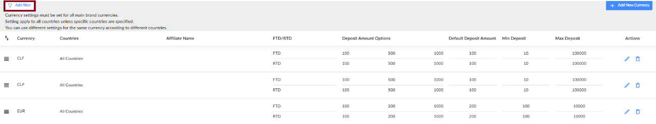 Configuring the currency settings in Cashier V2 ensures that payment processing aligns with the business needs. This setup determines the suggested, minimum, and maximum amounts displayed to customers on the deposit page, based on currency, country, and affiliate.