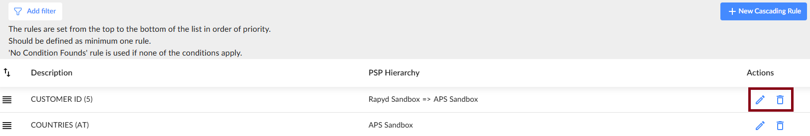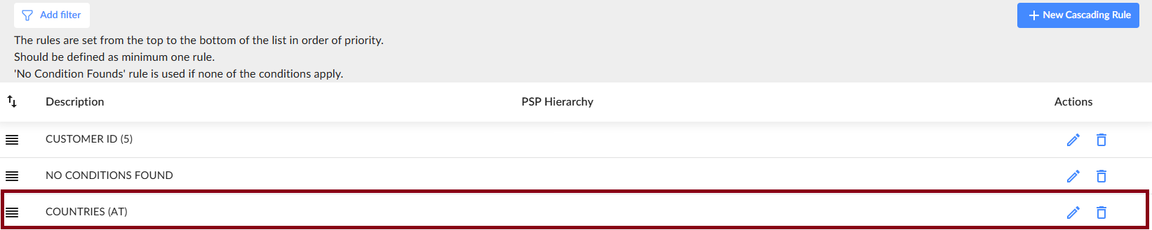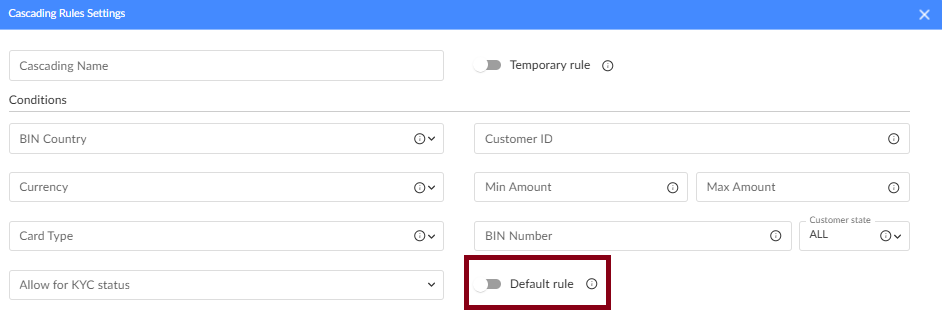 - The Cascading Rules feature checks each card payment request (e.g., deposit amount, BIN, customer email, etc.) against the active rules in the feature settings. The rules are applied in order, starting from the top of the list down to the default rule. Active rules are those listed above the default rule.