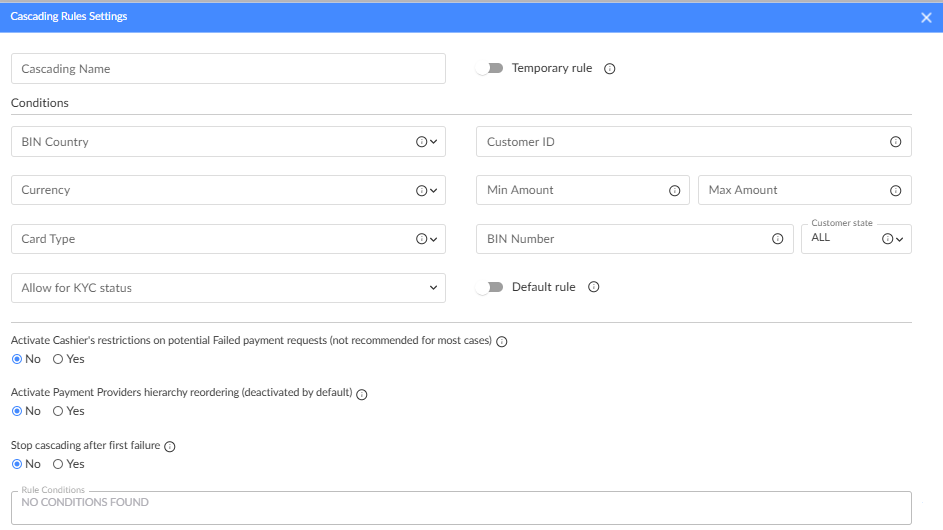 Cascading rules enable Cashier to determine the payment provider for a transaction by evaluating each customer deposit request against a set of criteria. These criteria (or rules) can include BIN Country, deposit amount, currency, and more.