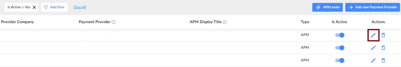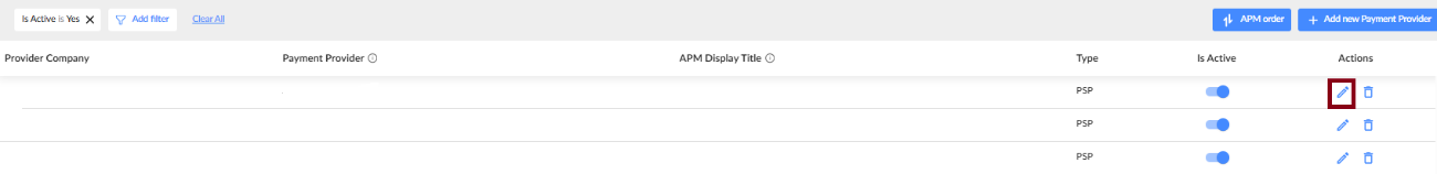 To access the advanced settings for the newly created APM, click Edit on the right side of the payment provider list.