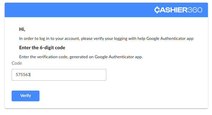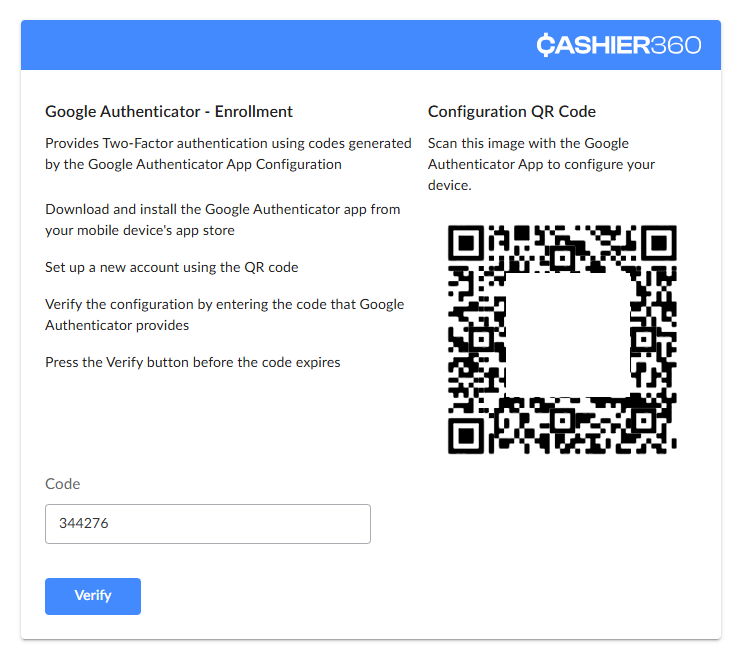 To comply with PCI DSS requirements, Cashier360 uses Two-Factor Authentication (2FA) with Google Authenticator for all Cashier Backoffice logins.