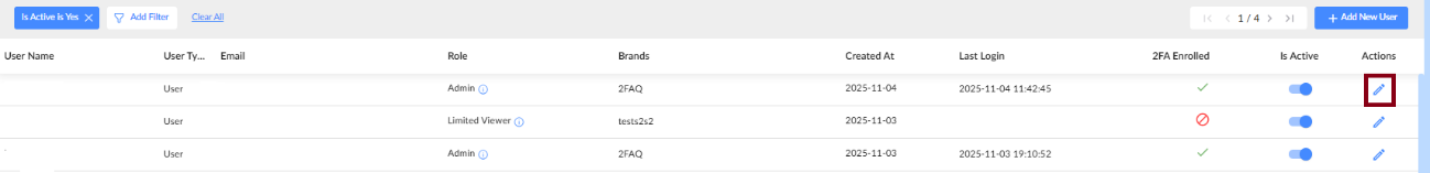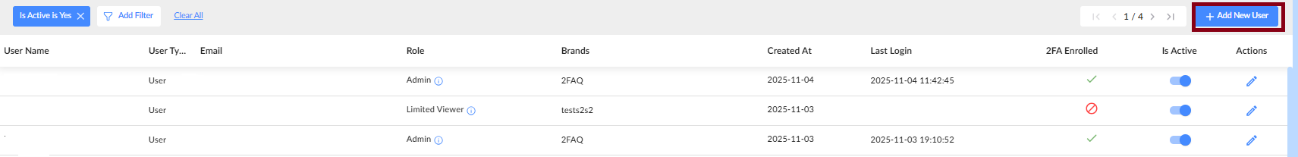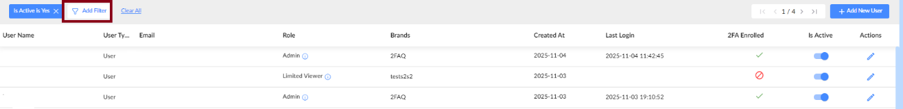 Click Add Filter at the top left to search for users by email, username, role, or brand.