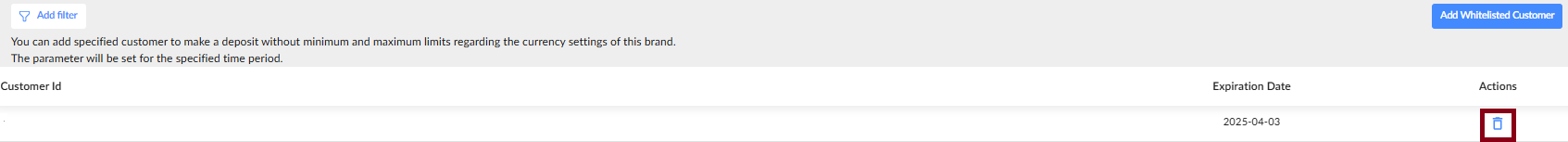 - Click the Remove icon next to a customer's entry to delete them from the whitelist. Confirm your action.