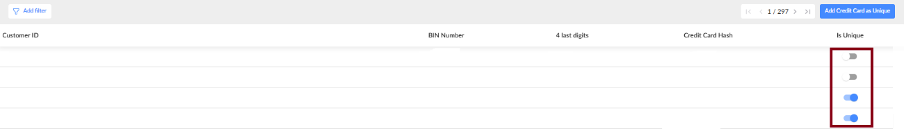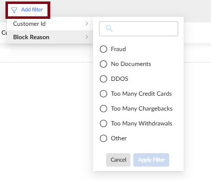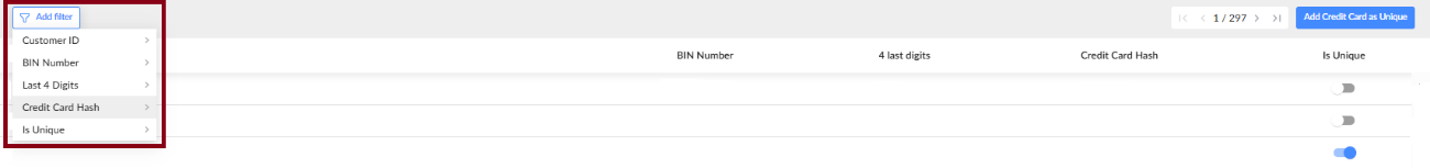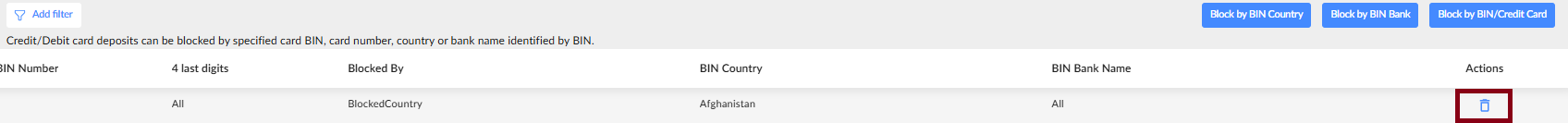 - Use the Add filter button at the top-left to filter your BIN/CC blocking rules.