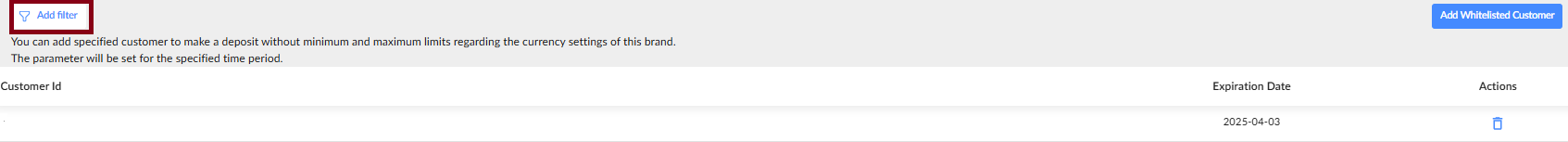 - Use the Add Filter button at the top-left to filter your whitelisted customers.
