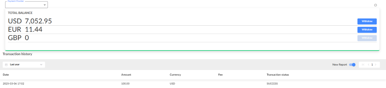 View the balance of the brand's merchant account, withdraw funds, and view the transaction history.