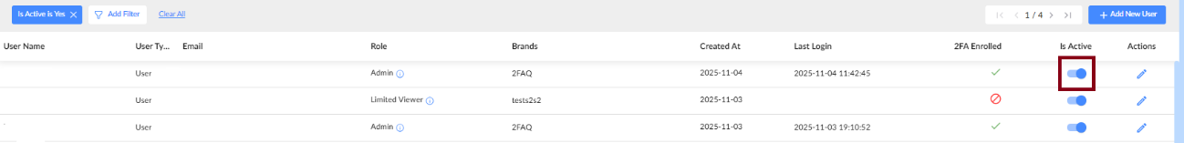 Toggle off the Is Active switch to deactivate users.