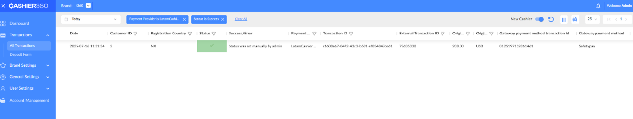 The All Transactions tab displays all transaction records, including time, status, source, and other relevant information. The data is presented in a customizable table, allowing users to adjust the column order and visibility.